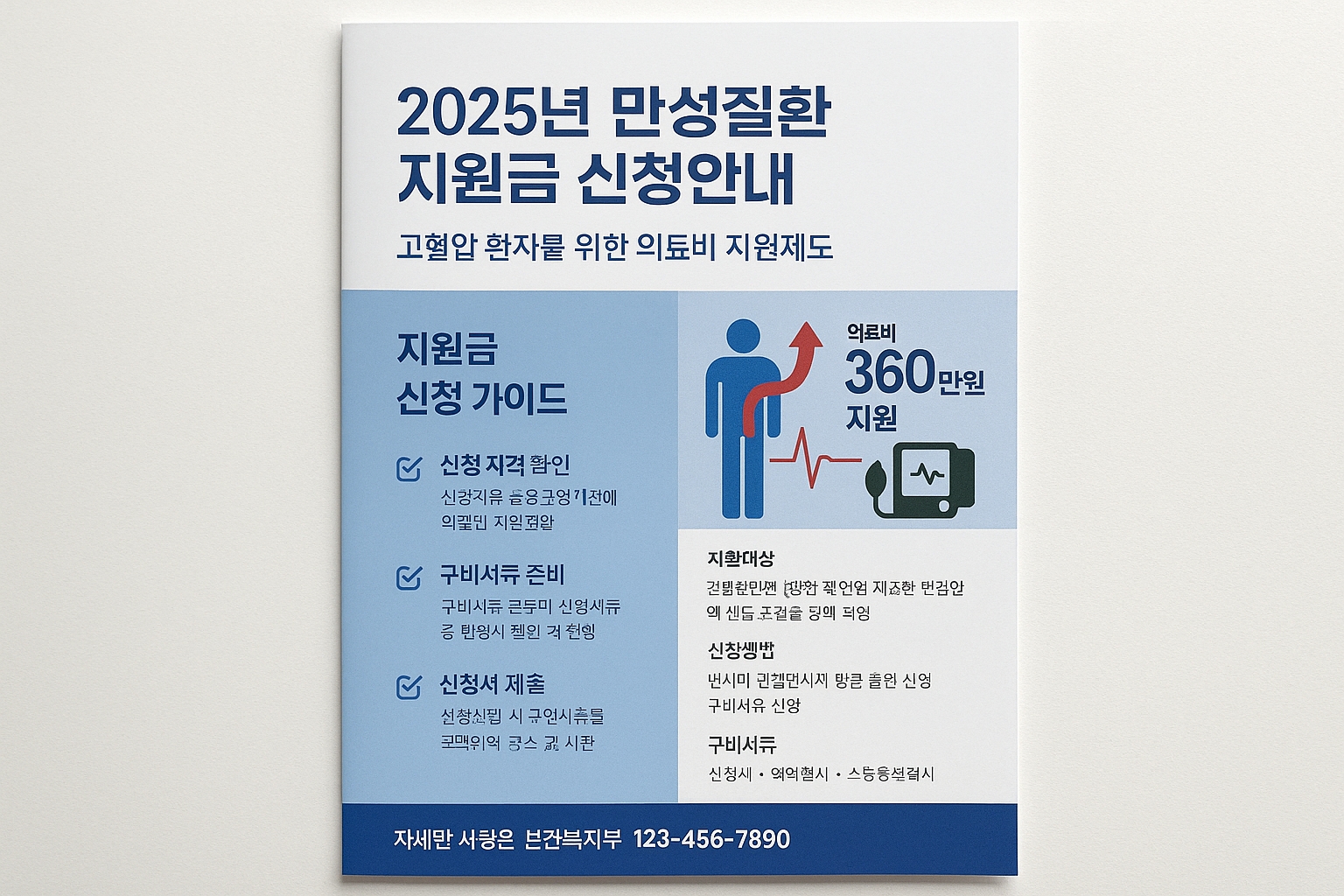 대상: 고혈압 진단 후 3년 이상 지속 치료자 지원내용: 월 약값의 30% 지원 (최대 월 2만원) 신청방법: 거주지 보건소 방문 신청
